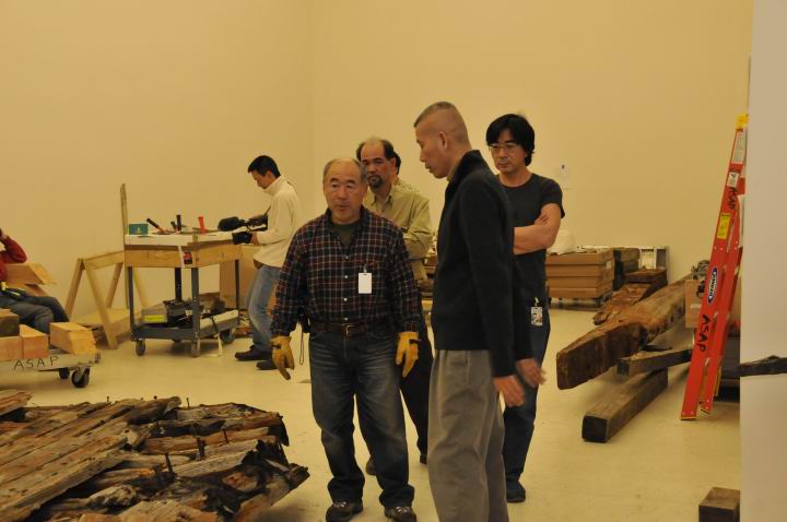 蔡さんは美術館内で複数の作業が進行しているが、大事なポイントで必ずチェックに来る。最上階に展示される廃船は特に大きな役割を持つようだ。私の仕事は、蔡さんの要望を把握してその基準どおりに美術館スタッフに組み立ててもらうこと。作業の進行ごとに美術館スタッフから通訳の麻生君を介して作業の方法が説明され、この方法で間違いないかと問われる。そして作業が進み仕上がるとその部分の確認を要請される。蔡さんの持っている物差しと私の基準が違ってないか常に考えなければならないのはかなりのプレッシャーになる。
